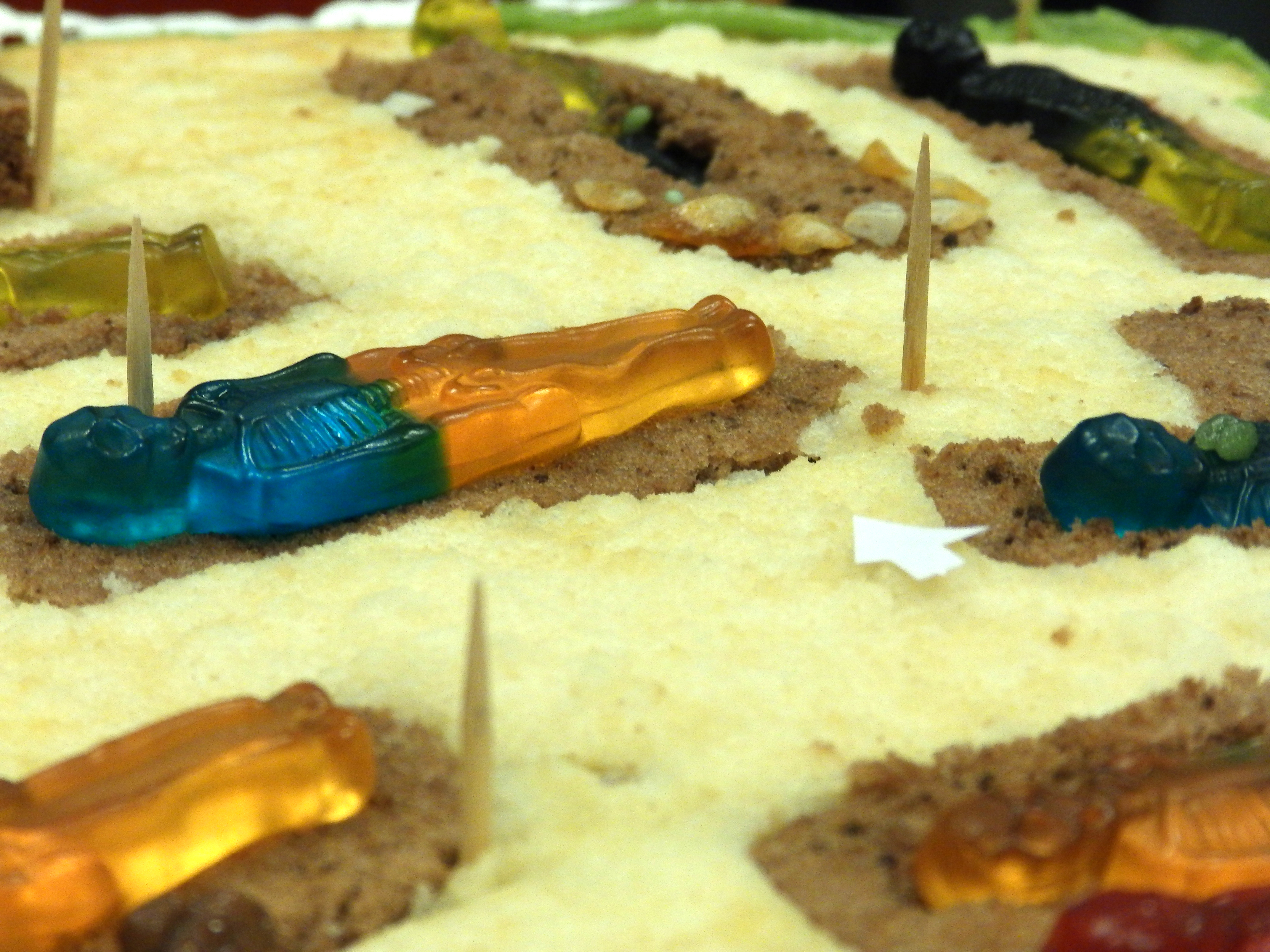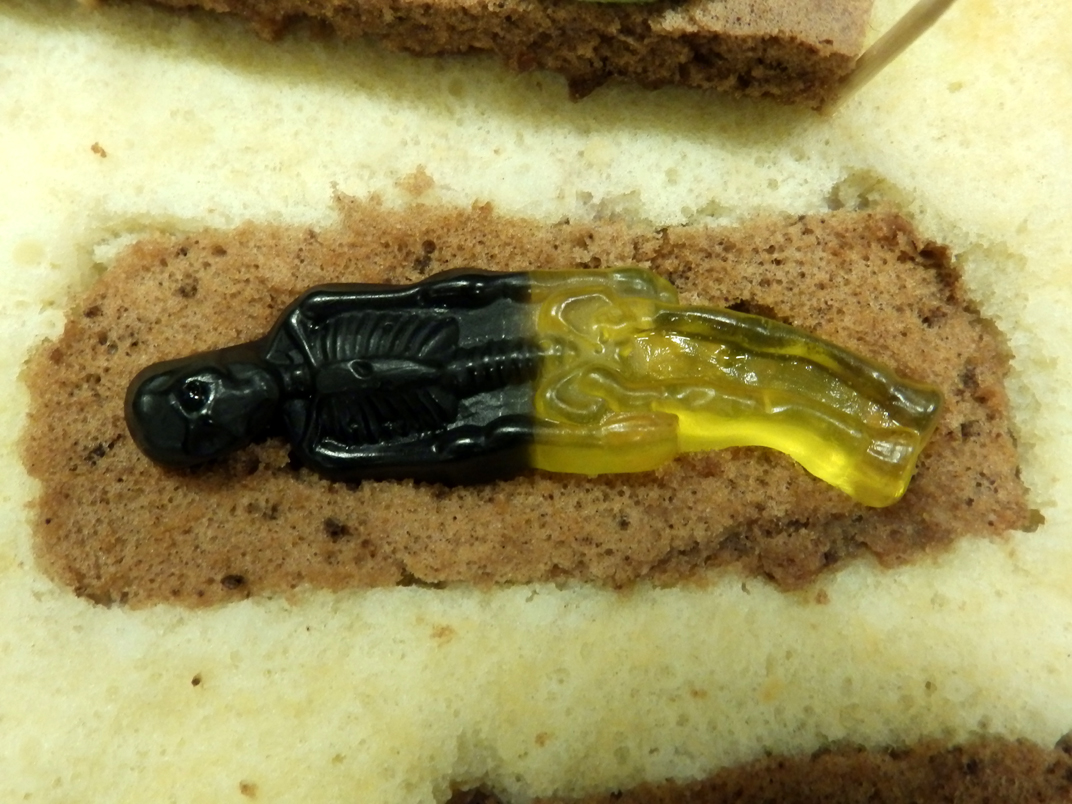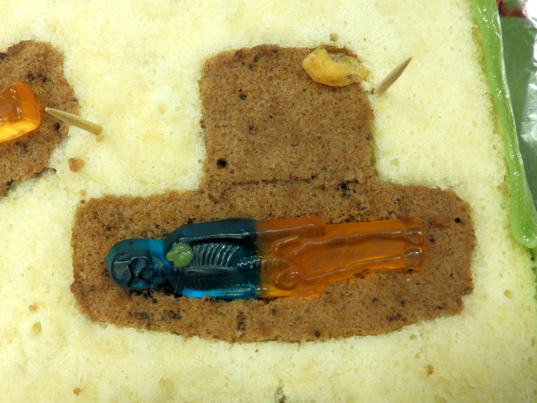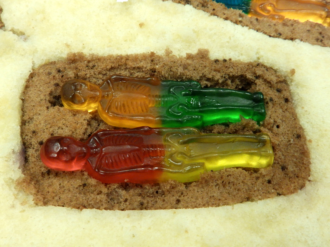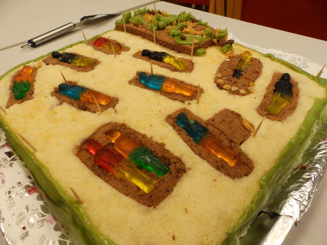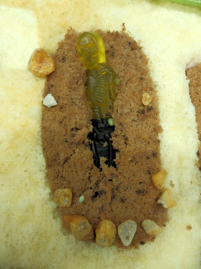 Kalmistopiiri osallistui pari päivää sitten päättyneeseen YLE Historian historiablogikisaan. Jo ehdokkuus oli pienelle ja rajattua aihepiiriä käsittelevälle blogille iso juttu, ja sitähän piti tietysti juhlistaa kuvien mukaisella kalmistokaivauskakulla. Kakkua syötiin tänään Turun yliopiston tiloissa, arkeologian opiskelijoiden ainejärjestö Vareen keskiviikkokahvituksessa, ja vain rippeet jäivät jäljelle.