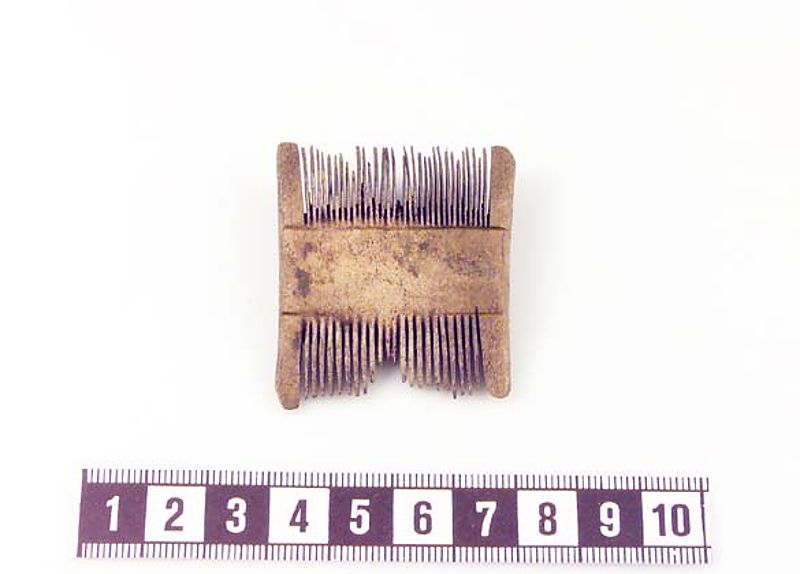 Viikinkiaikainen kampa Gotlannista (SHM 107745: 4927). Tiiviimmän puolen hammastuksen väli on pienempi kuin saivareiden koko, mistä syystä kaksiosaisia kampoja on luultavasti käytetty täikampoina. Historiska museet, kuva 28927.