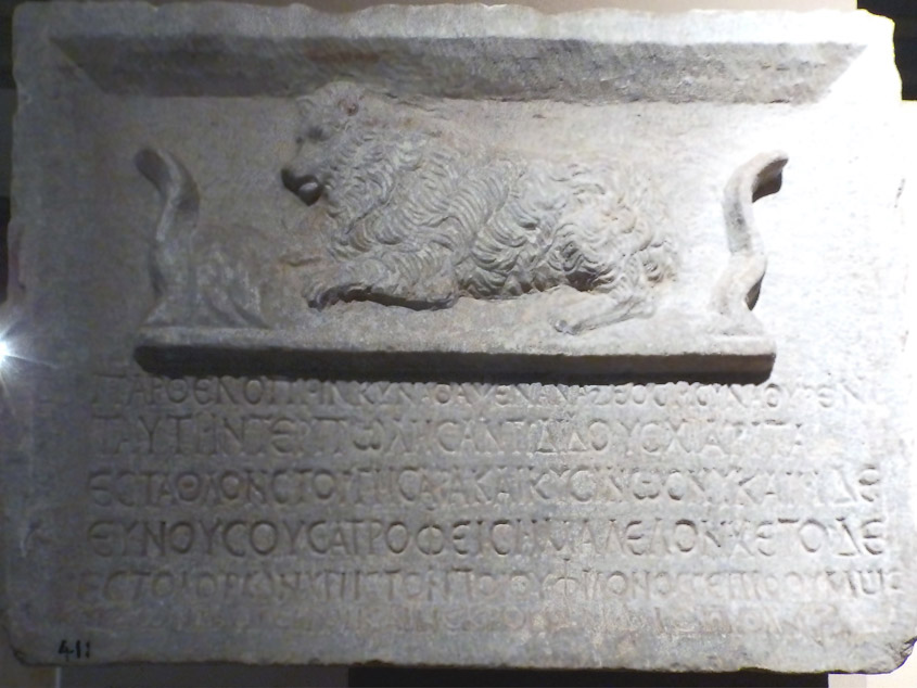 Anakseos on haudannut koiransa Parthenopen, jonka kanssa hän leikki, maksaen takaisin tämän tuoman ilon ja rakkauden; Olen ollut omistajani ystävä, joten ansaitsen tämän haudan; Katso tätä: etsi itsellesi ystävä, joka on valmis rakastamaan sinua kun olet elossa ja joka huolehtii sinusta kun olet kuollut.