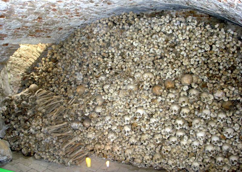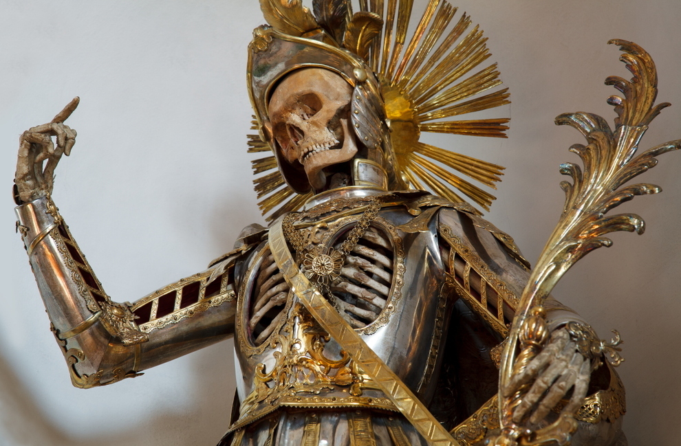 Vuonna 1578 Roomasta löydettiin maanalaisia katakombeja, joiden uskottiin sisältävän tuhansien varhaiskristillisten marttyyrien jäännöksiä. Näiden oletettujen pyhimysten luurankoja kuljetettiin 1700-luvulla saksankielisten maiden katolisiin kirkkoihin korvaamaan reliikkejä, joita oli tuhottu protestanttisen reformaation yhteydessä. Luurangot, jotka tunnettin ”katakombipyhimyksinä” puettiin peruukkeihin, kruunuihin, kultaan, jalokiviin ja haarniskoihin. Oletettujen pyhimysten tarkoituksena oli muistuttaa uskovia siitä rikkaudesta, joka heitä kuoleman jälkeen odotti.
