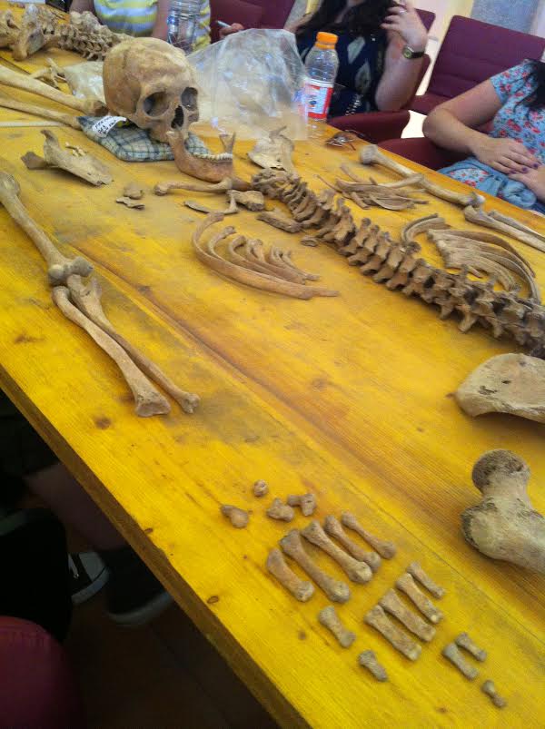 Kurssi koostui aamupäivällä pidetyistä luennoista ja niihin liittyneistä iltapäivällä tehdyistä harjoituksista. Lisäksi puhdistimme päivittäin luita, jotka olivat löytyneet paikallisen keskiaikaisen kirkon arkeologisilla kaivauksilla. Kirkko oli hautautunut tuhkan alle 1600-luvulla Vesuviuksen purkauksen seurauksena. Suurin osa kaivauksilla löytyneistä luista oli hyvässä kunnossa ja useiden vainajien kohdalla melkein kaikki luut olivat myös vielä tallella. Luiden puhdistuksen lisäksi myös kokosimme luurangon silloin, kun tiesimme laatikon sisältävän vain yhden vainajan jäänteitä. Itseäni tosin ainakin aluksi jännitti jonkin verran luiden käsittely, sillä pelkäsin rikkovani ne. Meille ei kuitenkaan juuri puhuttu luiden oikeanlaisesta käsittelystä ja puhdistuksesta. Ainoastaan pääkallon kohdalla meille näytettiin erikseen miten kalloa tuetaan sitä kannatellessa. Ohjaajat kannustivat meitä reilusti käsittelemään sekä tutkimaan luita, ja ainakin henkilökohtaisesti koin, että luiden päivittäinen käsittely tuki luennolla kuultujen asioiden oppimista.