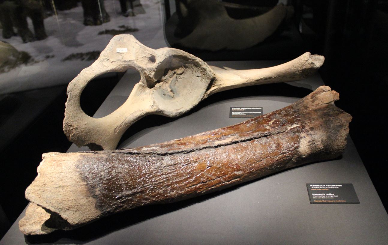 Saksan Neanderthal-museosta oli saatu lainaan paljon jääkauden megafaunan luuaineistoa ja löytökopioita. Kuvassa mammutin lonkkaluuta sekä etualalla värttinäluu. Kuva: Heli Etu-Sihvola.