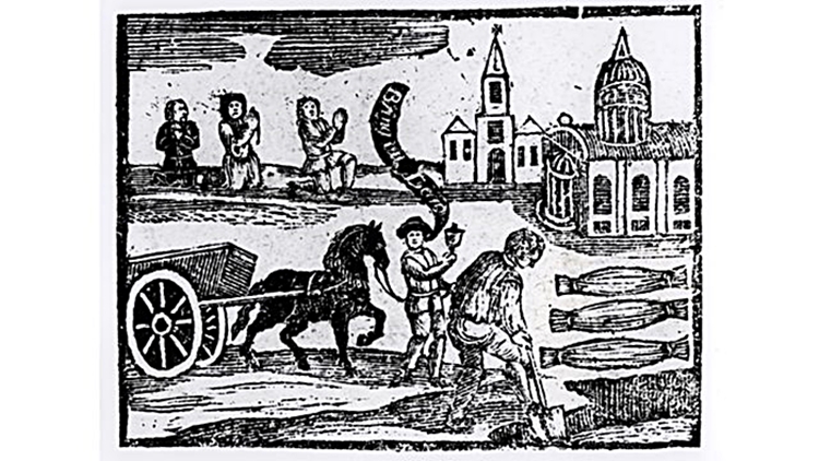 Haudankaivaja työssään 1600-luvun puupiirroksessa.