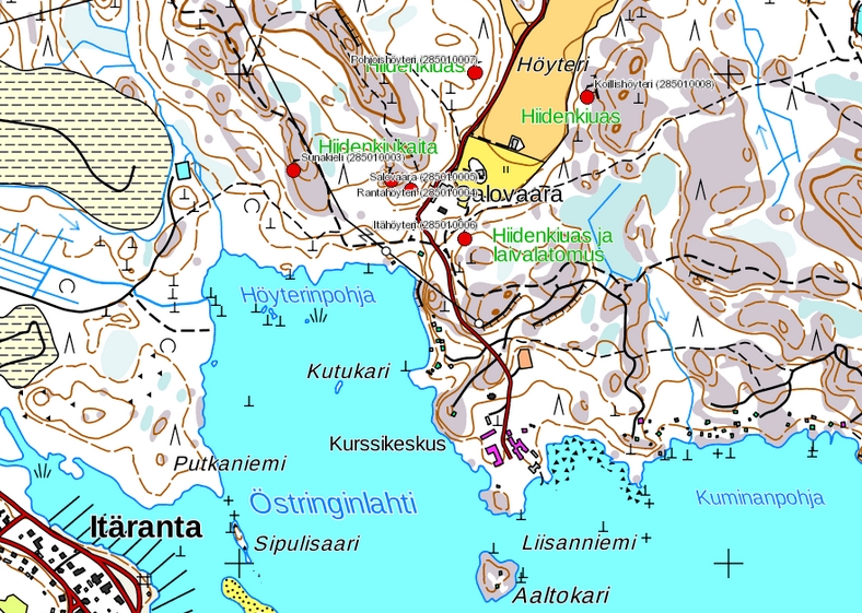 - Rantahöyteri: Kaksi kalliolla sijaitsevaa hiidenkiuasta ja laivalatomus, jotka myös ovat ilmeisesti olleet yhdistettynä toisiinsa siltamaisella kiveyksellä. Kohdetta on tutkittu vuonna 1947 (Rosén) ja 1993 (Miettinen).