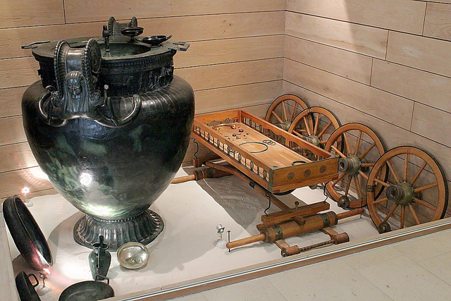 "Vixin prinsessana" tunnetun naisenhaudan vaunujen rekonstruktio sekä haudassa ollut massiivinen astia. Kuva: Claude Valette/Flickr CC.