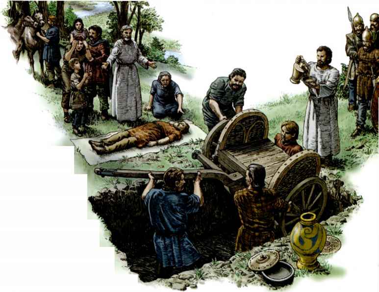 Taiteilijan näkemys kelttiläisestä vaunuhautauksesta. Kuva: Celticcultureblog.tk.
