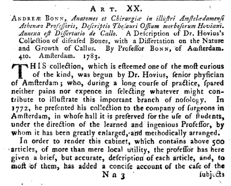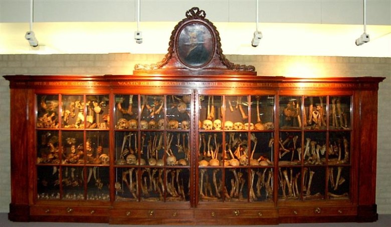 Osa näytteistä on sijoitettu vanhaan puuvitriiniin. Se tuo hieman lämpöä ja menneen ajan havinaa muuten hämärään ja kliiniseen tilaan. Kyseinen puukaappi on Hoviuksen 1700-luvulla keräämä luukabinetti, joka on myös näyttelyn vanhin esine. Se oli aiemmin Amsterdamin kirurgikillan omistuksessa ja sijaitsi yhä paikoillaan olevassa vaakatalossa (De Waag). Rakennuksessa oli käytössä anatomista opetusta varten rakennettu amfiteatteri, jonne Rembrandt maalasi nykyisin Haagin museossa olevan, Tulpin oppituntia esittelevän maalauksen. Hoviuksen kabinetin sisällöstä ei ole esillä paljoa tietoa, mutta tunnistin esillä olevista luista ainakin mahdollisesti synnynnäisestä ja myöhemmin elämän varrella hankitusta kupasta johtuvia muutoksia. Luissa on myös erilaisia murtumia ja yhdessä kallossa oli mahdollisesti kallonporauksesta syntynyt reikä. Kaikkien kabinetin luiden yksityiskohtaisempaan tarkastelemiseen saisi kulumaan runsaasti aikaa.