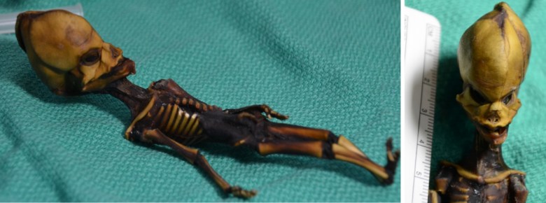 Vuonna 2003 Atacaman aavikolta löydettiin nahkapussin sisältä kankaaseen käärittynä hyvin pienikokoisen ihmisen muumioituneet jäännökset. Löytöolosuhteet ovat osittain hämärän peitossa, sillä ruumiin löysi keräilijä, jonka omistukseen muumio myös päätyi. Atacaman pieni muumio, lempinimeltään ”Ata”, poikkeaa täysin autiomaan muista muumiolöydöistä. Päällisin puolin tarkasteltuna ruumis muistuttaa noin 20 viikon ikäistä ihmissikiötä, mutta siinä on joitain huomattavan erikoisia piirteitä. Kallo on suhteellisen suuri ja yksilöltä puuttuu yksi kylkiluupari. Hampaat, nivelet ja sormet eivät vaikuta olevan sikiöajan, vaan noin seitsemän vuoden ikäisen lapsen, kehitysvaiheesta. Lisäksi kallossa on litistynyt ja voimakkaan suippeneva päälaki (Bhattacharya et al. 2018:423). Varhaiset havainnot uutisoitiin melko näyttävästi ja alusta saakka ”Ata” on kuulunut salaliittoteoreetikkojen sekä ufologien lempiaiheisiin. Koska ufologia usein yhdistää geoglyfit humanoideihin, Atacamasta löytynyt ”Ata” näyttäytyi pseudotieteen valossa varmalta todisteelta maan ulkopuolisten eliöiden vierailusta. Pikkumuumion omistaja on kuitenkin ollut avoin ihmisjäännöksestä tehtävälle tutkimukselle. Vainajasta on siten kertynyt myös vakavasti otettavaa tutkimustietoa, sillä sitä on mitattu, tietokoneskannattu ja kuvattu useasti löytymisensä jälkeen.