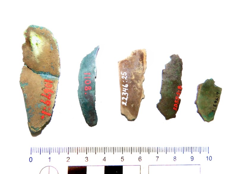 Löytökontekstilla on arkeologiassa suuri merkitys, sillä se vaikuttaa huomattavalla tavalla löytöjen tulkintoihin. Niin myös pronssikausitutkimuksessa. Alla olevassa kuvassa näkyy viisi koristelematonta pronssipellin kappaletta, joista neljä on vallitsevan arkeologisen tulkinnan mukaan karkeatekoisia myöhäispronssikautisia partaveitsiä.