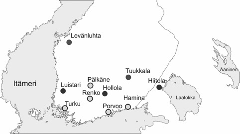 Tutkimuksessa mukana olleet kohteet. Tummat pisteet ovat rautakautisia kalmistoja, vaaleat keskiaikaisia tai nuorempia kohteita.