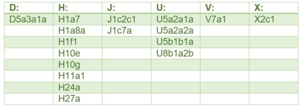 Tuukkalan tutkittujen vainajien joukossa äitilinjan haploryhmä H on yleisin. Nykyisin H-ryhmä on yleisin Länsi-Suomessa. Yhdellä yksilöllä oli haploryhmä U5b1b1a, jota on löydetty myös Levänluhdan vesikalmiston vainajilta (ks. esim. Uusi muinais-DNA-tutkimus: Suomen varhaiset äitilinjat kertovat asutuksen muutoksista). Sama ryhmä on nykyään yleinen erityisesti Fennoskandian pohjoisosissa ja saamelaisilla. Kiinnostava on kenties myös haploryhmä D5, jonka nykyinen levintä painottuu selvästi itään, muun muassa Kiinaan (Tambets et al. 2004). Tuukkalasta löytynyttä alaryhmää D5a3a1a esiintyy nykyisin harvinaisena esimerkiksi Suomen saamelaisilla sekä suomalais-ugrilaisilla manseilla.