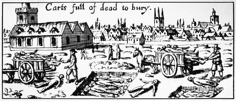 John Dunstallin puupiirros vuodelta 1665 esittää ruttohautoja Lontoossa.