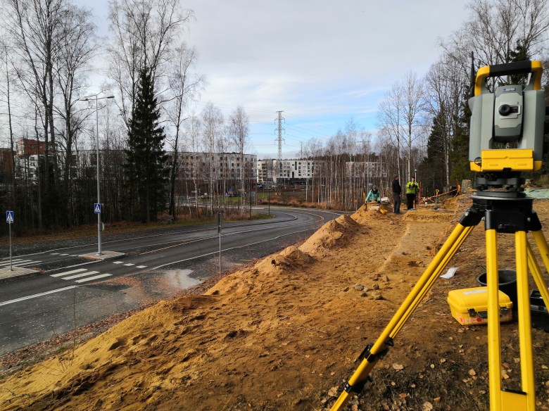 Löytöjen koordinaattien mittausta takymetrin avulla Espoon Tillinmäessä kivikauden asuinpaikan kaivauksilla syksyllä 2019. Kuva Johanna Roiha.
