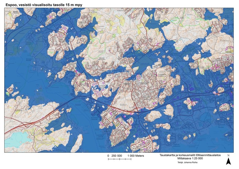 Karttavisualisointi Espoon rantavaiheista, merenpinnan ollessa korkeammalla suuri osa Espoon nykyistä rantaviivaa on ollut vielä merenpohjaa.