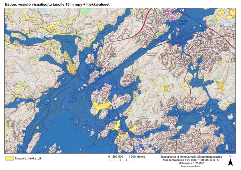 Karttavisualisointeihin voi lisätä maaperätietoja, tässä tapauksessa vesistömalliin on lisätty hiekka-alueita.
