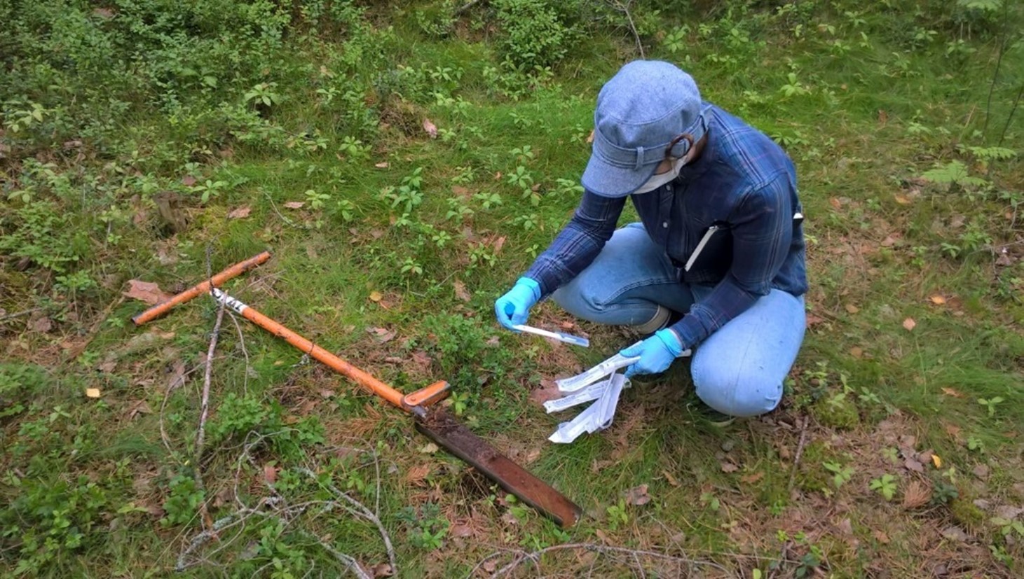 Heinäkuisena viikonloppuna 2018 suuntasimme siis yhdessä arkeologien kanssa kohti maanteitä. Käsikäyttöisellä maakairalla, hengityssuojaimilla, kumihanskoilla ja ämpärillisellä valkaisuainetta varustautuneina keräsimme maanäytteitä yhteensä viideltä kivikautiselta asuinpaikalta. Suoraviivaisesta lähestymistavasta huolimatta työ oli hidasta: kaira täytyi puhdistaa huolellisesti valkaisuaineella ennen näytteenottoa kontaminaation välttämiseksi, ja työskentely kasvosuojassa oli hikistä ja tukalaa. Kaivannot porattiin maanpinnalta käsin kaivamattomilta kohteilta, joten sopivaan likamaahan osuminen oli tuurista kiinni. Sokkokairauksesta huolimatta muutamasta painanteesta nousi lupaavan tummaa kulttuurikerrosta, ja näytteet varastoitiin pakastimeen odottamaan kuljetusta DNA-laboratorioon.