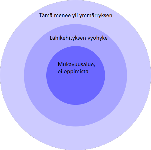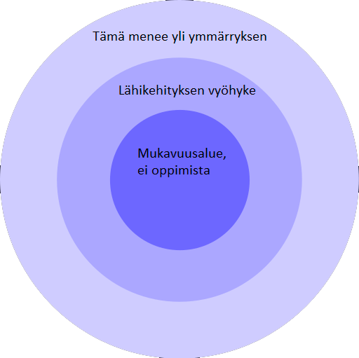 Lähikehityksen vyöhyke on nimetty teorian kehittäjän Lev Vygotskyn (1896–1934) määrittelemän alueen mukaan, joka sijaitsee ihmisen oman taito- ja tietotason sekä mahdollisen optimitason (Zone of Proximal Development) välissä (Vygotsky 1978: 86). Teorian mukaan kehittyneemmän henkilön läsnäolon tulisi auttaa yksilöä suoriutumaan tehtävistä, joita hän ei olisi itsekseen kyennyt ratkaisemaan. Yksilö kykenee toimimaan oman tieto- ja taitotasonsa ylärajoilla ja pystyy näin kurottamaan kohti omaa parasta oppimistulostaan (Säljö 2001: 120). Perustavana ajatuksena on, että itseään taitavampien yksilöiden kanssa toimiessa on mahdollista saavuttaa suurempia haasteita (Ravantti 2018: 13).