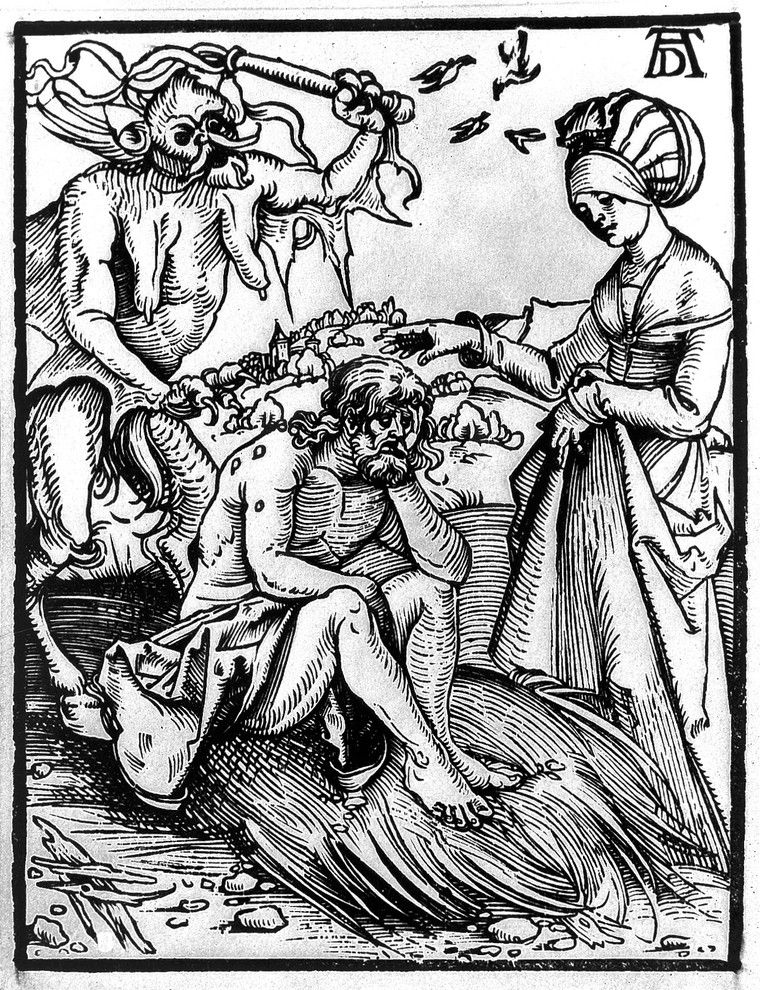 Pyhä Sebastian vetoaa Jeesukseen, että tämä säästäisi ruttoon sairastuneen haudankaivajan hengen. Teos: Josse Lieferinxr, noin 1497–1499. Kuva: Wikimedia Commons.