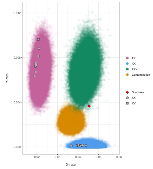 Uutta lähestymistavassa oli, että Suontaan vainajan verrokkeina käytettiin DNA-analyysissa hyvin toimineita muinaisyksilöitä ja simuloitiin sitä miltä näiden yksilöiden data näyttäisi, jos sitä olisi jäljellä yhtä vähän kuin Suontaan vainajalla. Analyysissa osoittautui, että Suontaan vainajan tulos ei juurikaan muistuttanut hyvin toimineita XX-yksilöitä – edes silloin kun näiden datasta käytettiin analyysiin vain pientä osaa. Toisaalta myöskään XY-yksilöt eivät muistuttaneet Suontaan tulosta. Kolmas mahdollinen selitys Suontaan tulokselle olisi, että tutkitussa näytteessä olisi sekaisin sekä XX- että XY-yksilöistä peräisin olevaa DNA:ta. Erilaiset ulkopuolisesta DNA:sta johtuvat epäpuhtaudet eivät nimittäin ole muinais-DNA-analyyseissa harvinaisia varsinkaan silloin, kun alkuperäisen yksilön DNA:ta on näytteessä jäljellä enää vähän. Kun tätä selitystä testattiin, sekoittunut data oli analyysin mukaan selvästi lähempänä Suontaan tulosta kuin pelkkä XX tai XY. Vielä enemmän Suontaan tulos kuitenkin muistutti neljättä testattua mallia, jossa tutkitulla yksilöllä olisi epätavallinen sukupuolikromosomiyhdistelmä XXY eli niin sanottu Klinefelterin oireyhtymä. Kun simulointi toistettiin 100 000 kertaa, Suontaan yksilö luokittui XXY:ksi 99,75 prosentin todennäköisyydellä ja sekoittuneeksi 0,25 prosentin todennäköisyydellä, kun taas sekä XX:n että XY:n todennäköisyys oli häviävän pieni. Tuloksen tulkinnassa pitää silti muistaa, että se perustuu hyvin pieneen datamäärään, mikä vaikuttaa erityisesti paljon X-kromosomia lyhyemmän Y:n kohdalla: X-kromosomeja Suontaan vainajalla on melko varmasti kaksi, mutta Y-kromosomin läsnäolon lopulliseen varmistamiseen tarvittaisiin enemmän DNA-dataa. Tämänhetkisen datan perusteella on kuitenkin todennäköisintä, että Suontaan yksilö olisi ollut XXY.