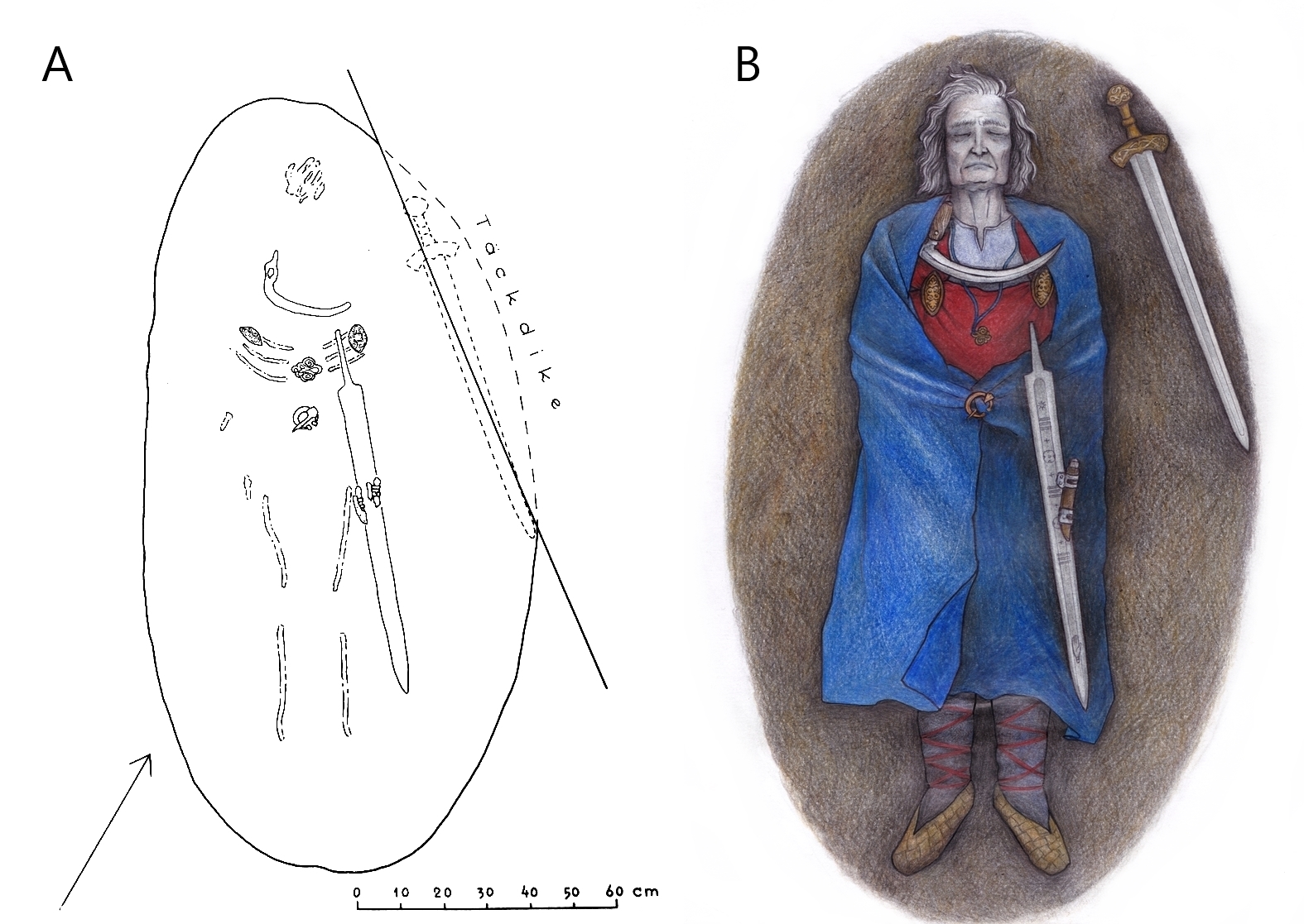 Haudasta nostettujen reisiluiden kappaleiden mukana säilytyslaatikkoon päätyi myös haudassa ollutta hiekkaa, jota tarkasteltiin uudessa tutkimuksessa mikroskoopin avulla. Hiekasta löydettiin useita karvojen ja höyhenten jäännöksiä. Suurin osa karvoista kuuluu lampaalle, eli ne ovat todennäköisesti peräisin villavaatteista. Karvojen värien perusteella vainajan vaatetus on ollut väriltään luonnonvalkoista ja sinertävänvihreää. Lisäksi tunnistettiin arvokkaita turkiseläimiä, kuten kettua tai näätäeläintä sekä jäniksen karvaa. Jäniksen karvoja tiedetään käytetyn lampaanvillan joukossa kallisarvoisissa tekstiileissä, mutta turkiseläinten karvat ovat voineet olla myös peräisin turkisvaatteista. Höyhenet ovat todennäköisesti peräisin hautaan asetetusta tyynystä tai peitteestä, jollaisia tunnetaan korkea-arvoisista hautauksista ympäri Skandinaviaa. Lintulajeja, joista höyhenet ovat peräisin, ei kuitenkaan ollut mahdollista tunnistaa tarkemmin.