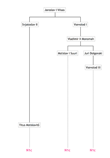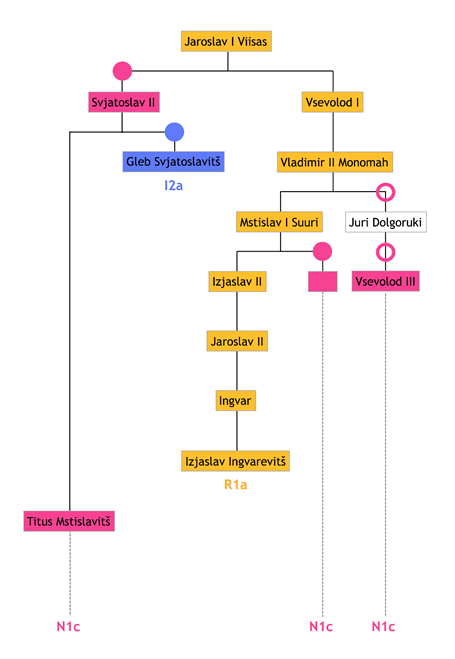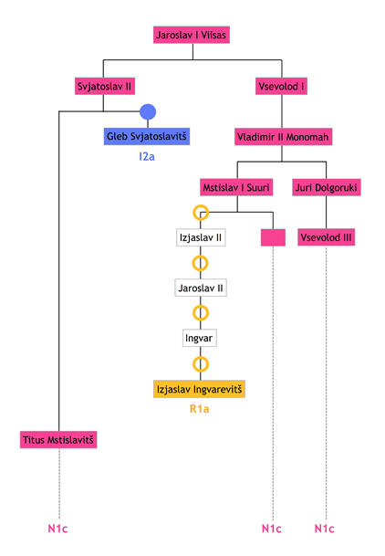 Sukupuutietojen mukaan kaikkien näiden sukujen yhteinen isänpuoleinen esi-isä olisi Jaroslav I Viisas, joka eli noin vuosina 978–1054. Niinpä nykyruhtinassukujen yhteinen Y-kromosomimuoto N1c olisi peräisin häneltä (kuva). Legendan mukaan Jaroslav Viisas oli Rurikin pojanpojan pojanpoika. Jos legenda pitää paikkansa, Jaroslav Viisas olisi siis perinyt Y-kromosominsa Rurikilta eli myös Rurik olisi ollut N1c. Legendan sukupuutietojen paikkansapitävyyttä on kuitenkin vaikea arvioida, sillä ne on merkitty muistiin vasta 1100-luvun alkupuolella, ja sitä ennen matkan varrelle on voinut osua vääriä isyyksiä tai muuta sekaannusta.