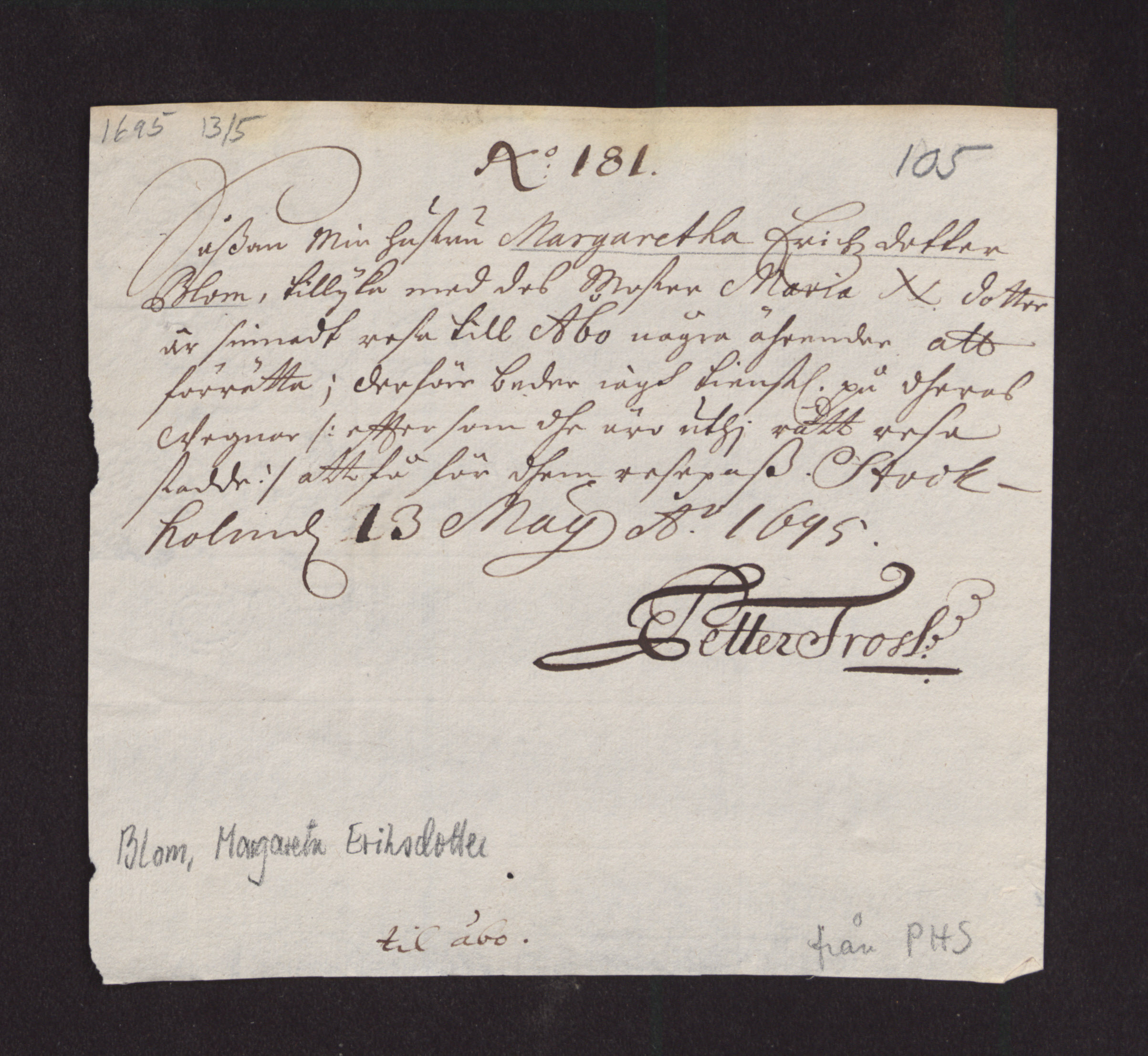 Piika Karin Henriksdotter oli palvellut vuonna 1686 porvari Matts Teetillä ja matkustanut sitten Jöran Lamberin kuutolla Tallinnaan etsimään onneaan. Karin ei ollut saanut kuitenkaan palveluspaikkaa Tallinnasta ja oli siksi palannut takaisin Turkuun. Matts Teetin vaimo oli antanut Karinille riikintaalarin, jotta tämä tekisi vaimolle tavarahankintoja. Karin joutui lopulta maksamaan laivurille edestakaisesta matkastaan kolme taalaria.