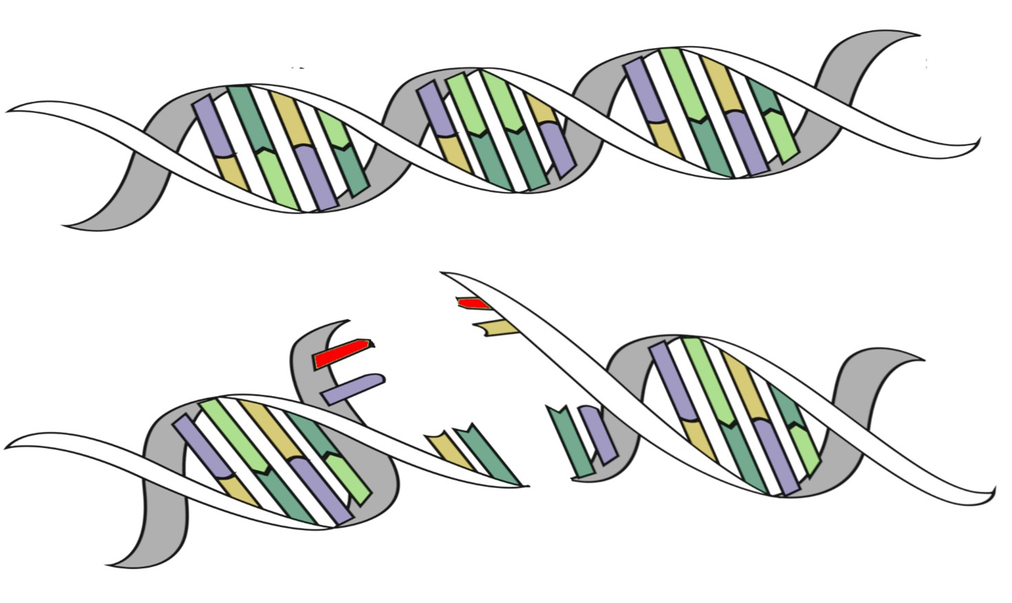 DNA pilkkoutuu hajotessaan lyhyiksi pätkiksi ja katkeamiskohtien emäkset jäävät alttiiksi kemiallisille vaurioille. Tietyt vauriot ovat niin tavallisia, että niiden avulla voidaan erottaa vanhat molekyylit tuoreesta DNA:sta. Kuva: Wikimedia Commons, muokkaus: S. Peltola.