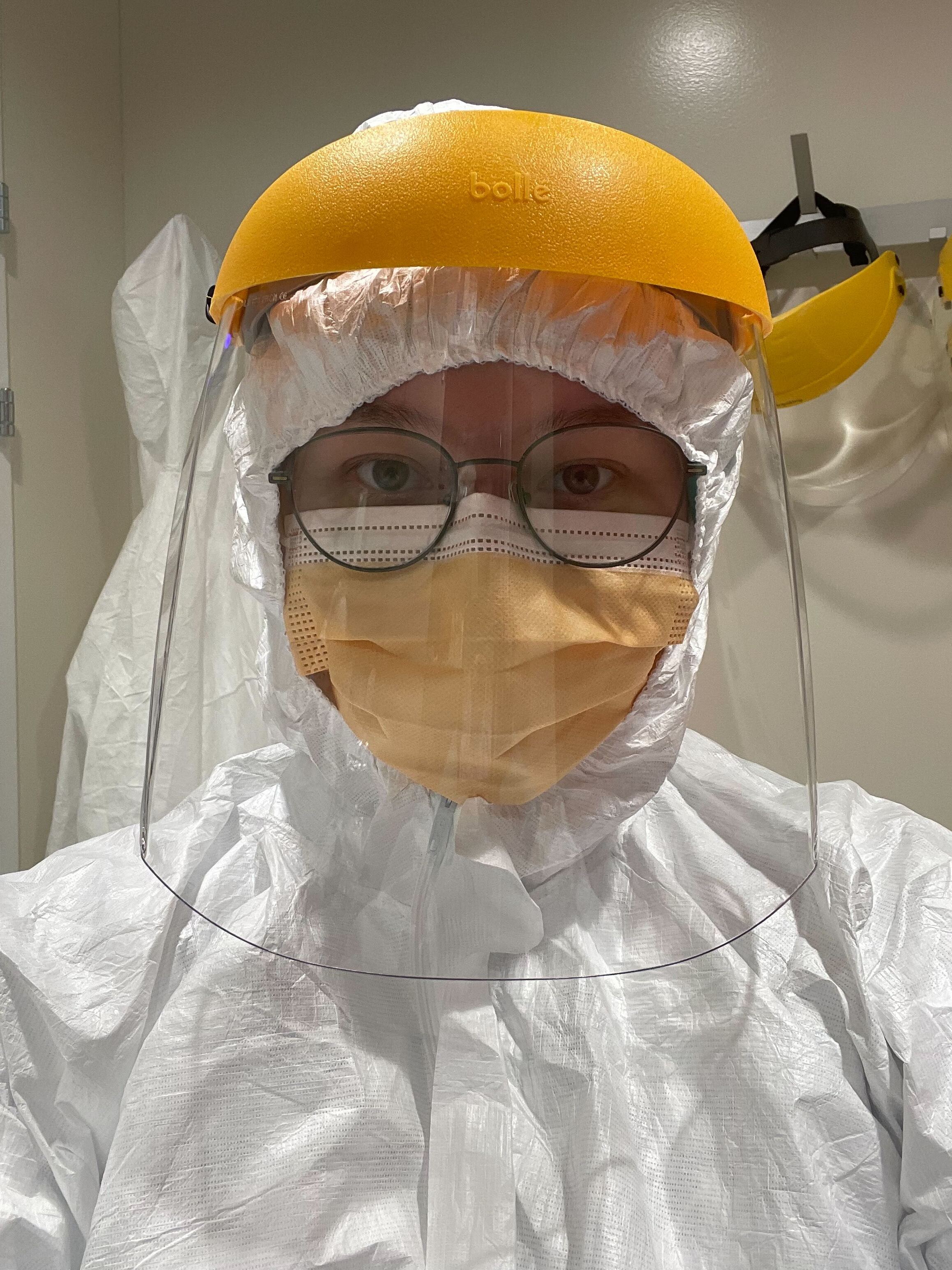 Muinais-DNA-laboratoriossa työskennellään vain raskaissa suojavarusteissa, jotta tutkittavaan DNA:han ei sekoittuisi tutkijan omaa DNA:ta. Näytteitä suojataan myös monilla muilla keinoilla, kuten alipaineistetulla ilmanvaihdolla ja tilojen UV-puhdistuksella. Kuva: Sofia Paasikivi.