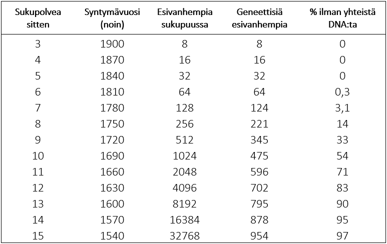 Entä sitten muut perimänosat kuin mitokondrio-DNA ja Y-kromosomi? Koska ne periytyvät molemmilta vanhemmilta, niillä pystytään näkemään yhteyksiä muihinkin kuin isä- tai äitilinjan sukulaisiin. Silti niilläkin erotuskyvyn rajat tulevat suhteellisen pian vastaan. Ensinnäkään meillä ei suinkaan ole DNA:ta kaikilta esivanhemmiltamme. Tämä johtuu siitä tavasta, jolla vanhemman DNA puolitetaan sukusolujen muodostumisprosessissa. On jokseenkin varmaa, että meillä on DNA:ta kaikilta isoisovanhemmiltamme ja myös kaikilta viiden sukupolven takaisilta esivanhemmilta, mutta jo kahdeksan sukupolven takaisissa esivanhemmissa on keskimäärin 14 prosenttia sellaisia, joilta meille ei ole periytynyt lainkaan DNA:ta, ja kymmenennessä sukupolvessa yli puolet.