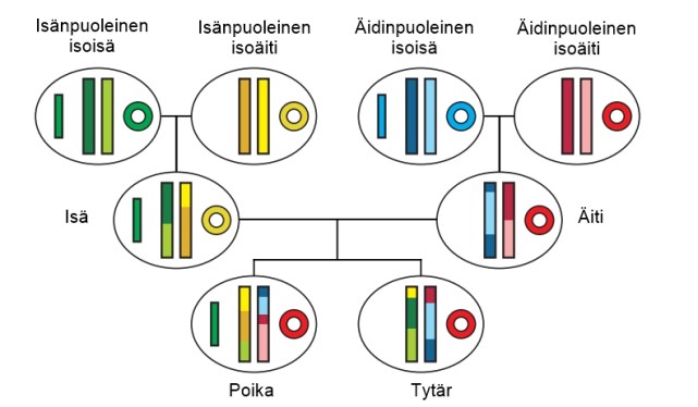 Koska DNA periytyy vanhemmilta jälkeläisille, se periaatteessa kantaa tietoa sukulaisuuksista. Eri perimänosat periytyvät eri tavalla, ja se vaikuttaa siihen, miten sukulaisuudet voidaan niistä nähdä. Pääsääntö on, että puolet DNA:stamme on isältä, puolet äidiltä perittyä: joka kromosomiparissa yksi kromosomi kummaltakin vanhemmalta. Sukupuolikromosomeista Y-kromosomi periytyy isältä pojalle muodostaen ns. isälinjoja. (Y:n vastinparina oleva X periytyy isältä tyttärelle. Naisilla puolestaan on kaksi X-kromosomia, joista lapsille – sekä tyttärille että pojille – päätyy yksi.) Lisäksi solun energiatehtaalla, mitokondriolla, on oma erillinen DNA:nsa, joka periytyy aina äidiltä eli muodostaa äitilinjoja.