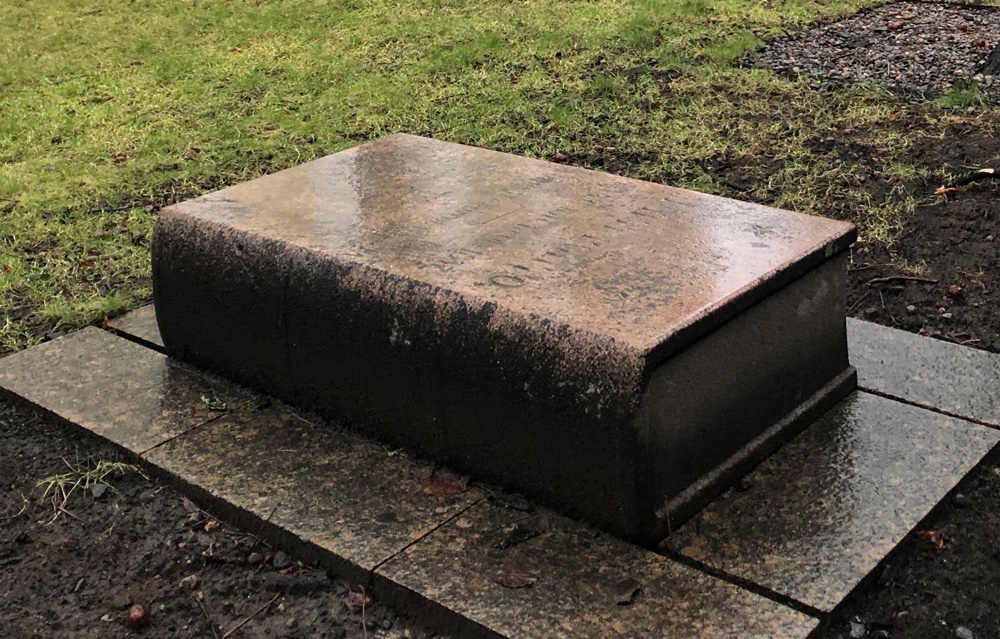 Matti Pohdon kirjaa muistuttava hautamuistomerkki on siirretty Lepolasta Helsinkiin, kansalliskirjaston pihalle. Kuva: Kaisa Kautto.