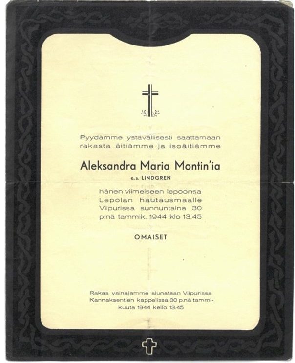 Vainajan sukulaisille kenttäpostina saapunut hautajaiskutsu. Liisa Montinin kotiarkisto.