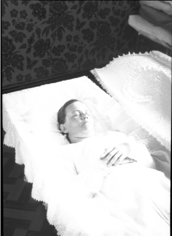Valkoisiin puettu ruumis valkoiseksi verhotussa arkussa. Kuva: Jalmari Lankinen (1930), Lappeenrannan museot.