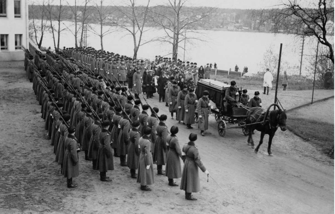 Vänrikki Nestor Kajaston (ent. Sneck) ruumissaatto kulki Viipurin sotilassairaalasta Ristimäen vanhalle hautausmaalle. Kuva: Eino Luukkasen kokoelma, Suomen Ilmailumuseo.