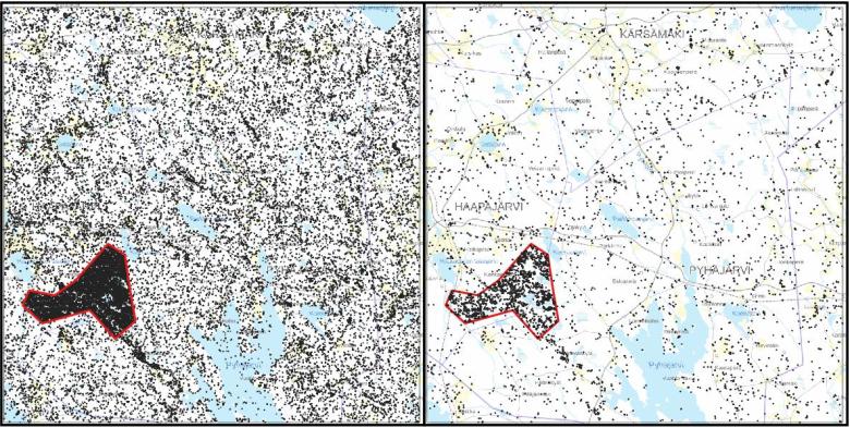 Nykypäivän geopolitiikka vaikuttaa myös pyyntikuoppien tunnistamiseen ja suodattamiseen, sillä Suomella on 1300 kilometriä yhteistä maarajaa Venäjän kanssa ja rajavyöhykkeen lisäksi useita sotilasalueita, joilla aluevalvontalaki (755/2000) rajoittaa ilmakuvien ja paikkatietojen keräämistä ja jakelua. Maanmittauslaitos on joutunut harventamaan näiden alueiden LiDAR-aineiston tarkkuutta tasolle 0,3 pistettä/m2. Tämä rajoittaa tunnistusalgoritmien käyttöä aluevalvontalain alaisilla alueilla. Tervahautojen ja hiilimiilujen kaltaiset laajat ja erottuvat muinaisjäännökset ovat tunnistettavissa kohtalaisella tarkkuudella, kuoppajäännösten kaltaiset pienet kohteet eivät taas erotu visualisoinneista ja niitä ennustavia polygoneja on aineiston karkeapiirteisyyden vuoksi ylenpalttisesti (Kuva 3).