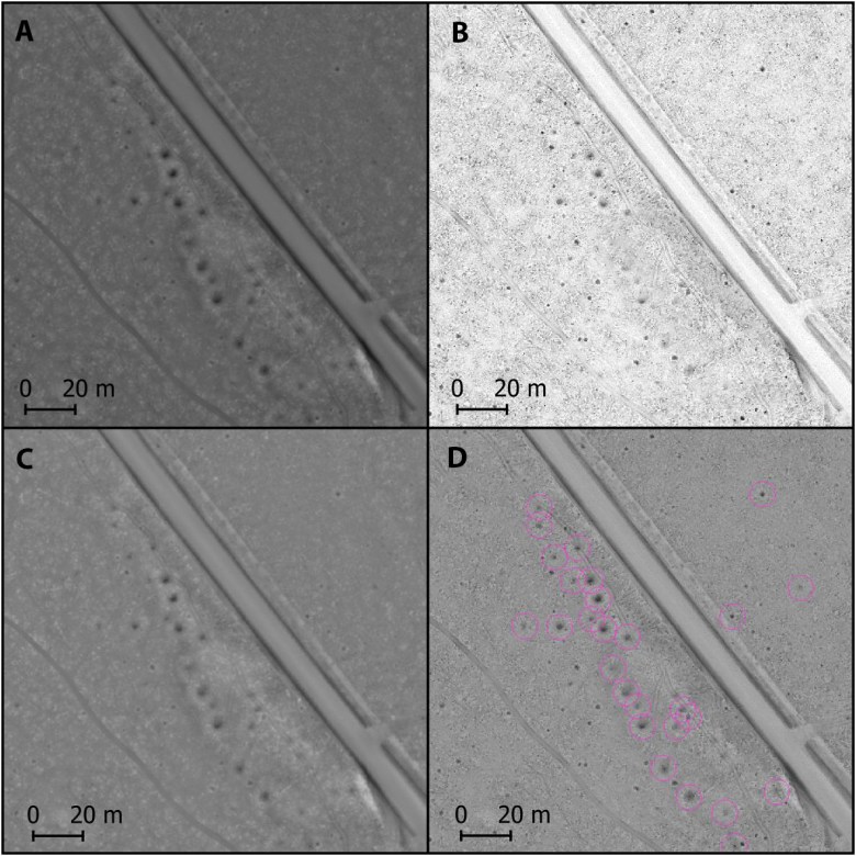 Aluksi tarkasteltiin ennustavan mallin tuottamaa yleiskuvaa kuoppajäännösten levinnästä näissä kohteissa. Sen perustana olivat samat Topographic Position Index (TPI) visualisoinnit, joita algoritmi käyttää kohteiden etsimiseen. Visualisoinnit on luotu 0,25 x 0,25 metrin pikselikoolla, ja niissä yksittäisen pikselin korkeusasemaa verrataan ympäröivien pikselien korkeuden keskiarvoon 30 pikselin eli 7,5 metrin säteellä. Tämän aineiston perusteella kaikista kolmesta pyyntikuoppakohteesta tehtiin tarkempi aluerajaus. Aluerajauksen avulla valittiin utm1-paikannusruudustosta ne ruudut, jotka leikkaavat tutkimusaluetta. Niistä luodun indeksin perusteella kirjoitettiin uudet, pikselikooltaan 0,2 x 0,2 metriset maastomallit (DTM) alkuperäisistä laserkeilausblokeista. Maastomallista tuotettiin kolme uutta visualisointia (Kuva 4). Algoritmipaketin omalla työkalulla laskettiin ensinnäkin uusi TPI-paikkaindeksi, jossa etsintäsäteenä käytettiin 15 pikseliä eli 3 metriä. Lisäksi käytettiin Relief Visualization Tool -ohjelmaa, jolla tehtiin säteeltään vastaava taivasnäkymäanalyysi (sky view factor, SVF) ja paikallinen hallitsevuusanalyysi (local dominance, LD) 15–25 pikselin eli 3–5 metrin säteellä.