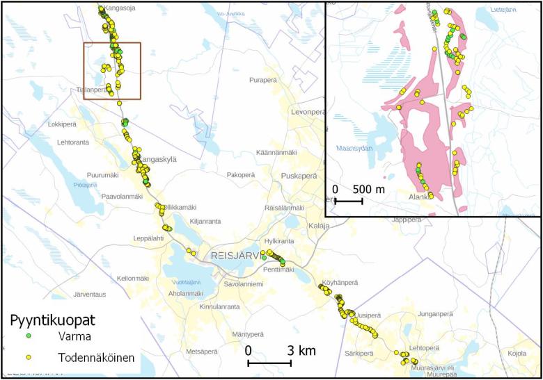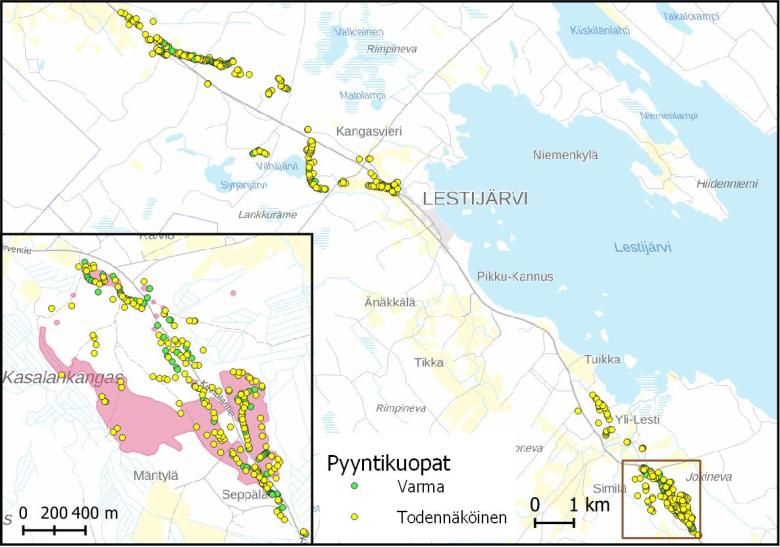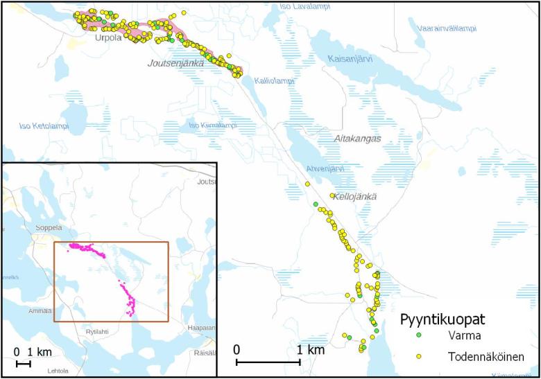Suodattamisen ongelmaa voi myös lähestyä käänteisesti, priorisoimalla alueita, joiden tiedetään olevan pyyntikuoppien esiintymisympäristöjä. Esimerkiksi Arkeologisen kulttuuriperinnön opas kertoo: ”Kuopat on yleensä kaivettu hiekkamaahan luonnollisten esteiden rajaamalle kapeikoille kuten järvien välisille kannaksille tai jokien ja harjujen rajaamille alueille. Kuoppajärjestelmät ovat sijoittuneet maastoon peurojen luontaisten vaellusreittien suuntaisina jonoina …” Nämä kriteerit voidaan visualisoida kartalle käyttämällä Geologian tutkimuskeskuksen Maaperä-tietokannassa olevaa ”Jäätikkösyntyiset maaperämuodostumat: jäätikköjokisyntyiset ja moreenimuodostumat” -tasoa (Kuva 1). Kun 13.2.2023 suoritettu haku alatyypin ”pyyntikuopat” määritteellä Muinaisjäännösrekisteristä tuotti yhteensä 2235 kohdetta – 1436:lla niistä on myös määritelty aluerajaus – yli puolet kohteista sijaitsee harjuilla tai niiden lievehiekkamuodostumissa.