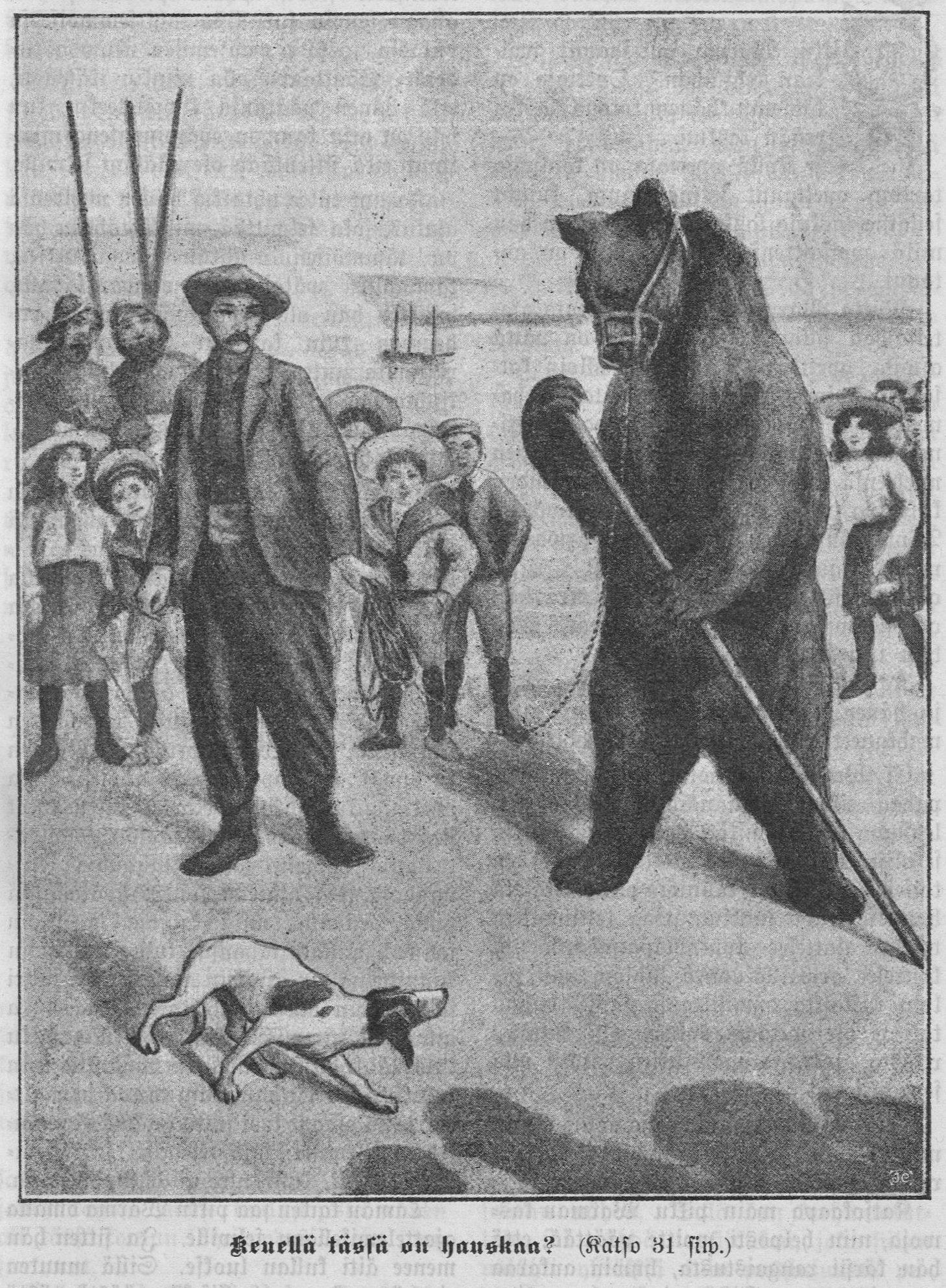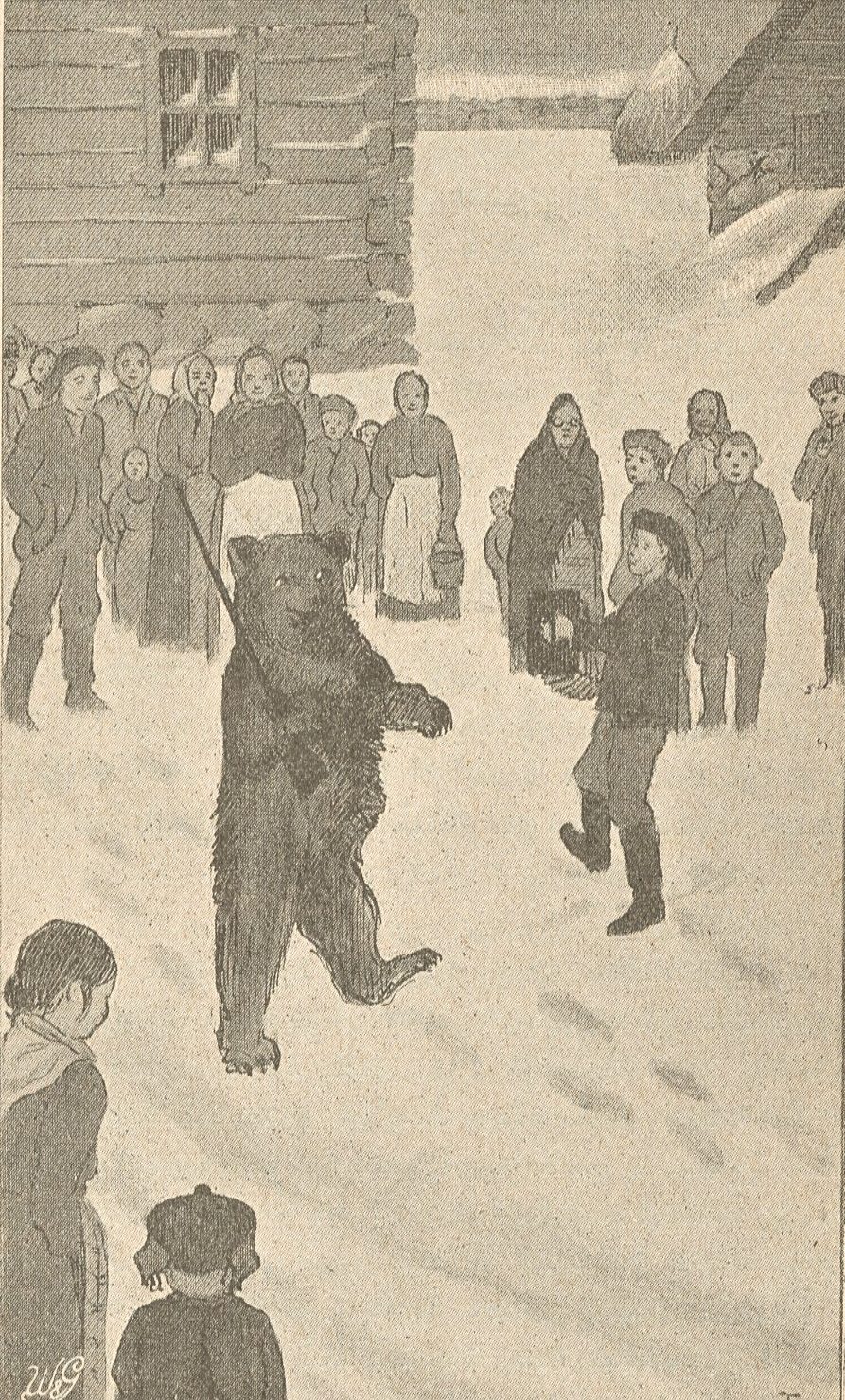 Helposti sen olisi kumminkin voinut huomata kuka tahansa, joka vain olisi tarkannut karhun surullista, rasittunutta naamaa ja sen raskaita, kömpelöitä liikkeitä sekä kuunnellut sen tyytymätöntä mörinää ja huokailuja. Ja olisi sen helposti käsittänyt silläkin, jos olisi vain asiaa tarkemmin ajatellut. Sillä eihän karhua ole tanssijaksi eikä muuksi temppuilijaksi luotu. Tämäkin karhu oli syntynyt metsän korvessa sammalisessa pesässä. Sieltä se oli raastettu ihmisten pariin. Ja monta kovaa päivää sekä monta ankaraa lyöntiä se oli saanut kestää, ennenkuin se oli taipunut tekemään nuo temppunsa. Sen tähden eivät tämmöiset temput sitä ollenkaan huvittaneet.”