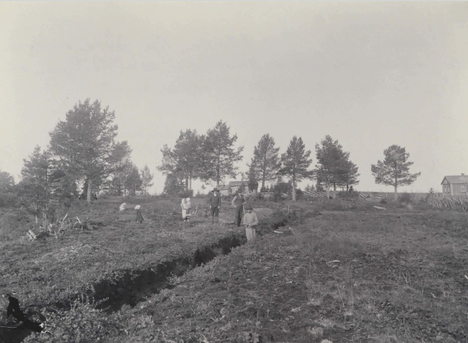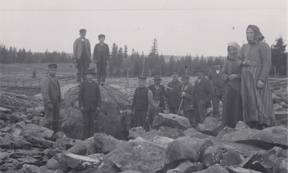 Sodankylän Petkulan löytöpaikka oli taas toisentyyppinen. Tutkimuskohteena oli pronssimiekkojen löytöpaikka (ks. tarkemmin Salminen 2019): ”Paikkaa tutkitin sillä lailla, että lastoilla poistin sammalen, jonka alta melkein välittömästi tuli liuskekerros näkyviin. Tämä oli halkeillut ja muodostellut laakoja ja levyjä, jotka ylinnä olivat enimmäkseen vaakasuorassa, sen alla viistoon. Paikoin oli kiviaines hajonnut maaksi. Tämä kaikki ja muukin pintakerros lastalla tarkoin tutkittiin ja seulottiin, mutta tuloksetta. Sen jälkeen ruvettiin vipuamaan kiveä (ks. kuvaa) ja se saatiin kohoamaan, jonka jälkeen itse ryömin kiven alle ja tutkin sen alustan. Pinta oli siinäkin liuskaa, joka oli lohkeillut viistoon. Kappaleet otettiin yksitellen pois, ja sen sija aina tutkittiin. Tulos oli tässäkin tapauksessa negativinen.” (MVA Tallgrenin kertomus tutkimuksista Sodankylän Petkulan Vajukoskella 1907)