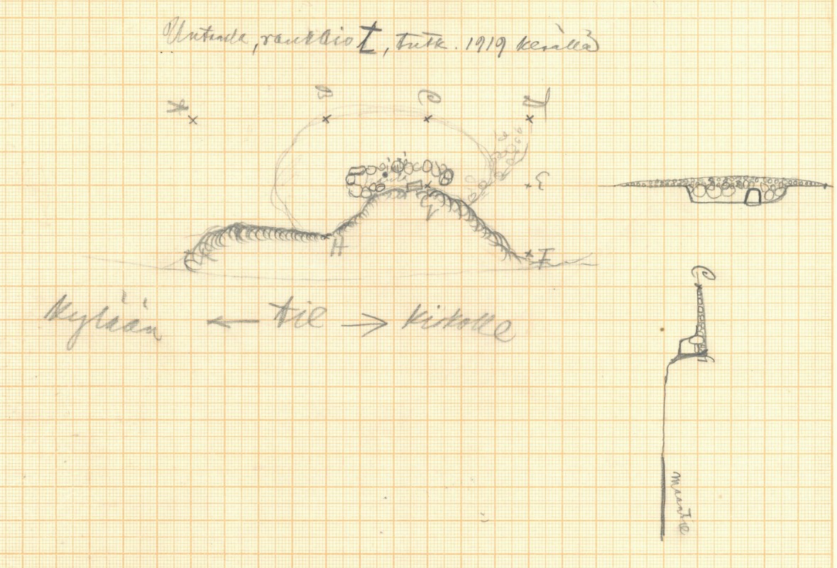 Kaivautin tällä eteläsivustalla 7 m. pituisen ja 3 m. levyisen vyöhykkeen. Ensin poistettiin pinta ja kun keltaisessa savisantamaassa selvästi näkyi kuopan rajat, kaivettiin niiden ympäri syvät ojat kulttuurimaan pohjaan asti. Näin paljastui 3 kiinteätä muinaisjäännöstä, mitkä nähtävästi eivät ole hautoja. Ne olivat kaikki olleet alkuaan arvatenkin olleet [sic] maahan kaivettuja kuoppia, asumusten kanssa tekemisissä.” (MVA Tallgrenin kertomus tutkimuksista Raudun Haapakylässä 1916)