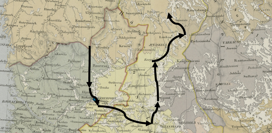 Luovuttuaan muuttoajatuksesta Johan Kauppi jatkoi esineiden lähettämistä. Joulukuussa alussa 1894 hän oli Iisalmessa (KM3030), pari viikkoa myöhemmin Kajaanissa (KM3035) ja tammikuun lopussa Muhoksella (KM3045). Pohjoisessa Johan Kauppi teki u-käännöksen ja maaliskuusta elokuuhun kiersi Karjalassa (KM3070, KM3091, KM3102, KM3108, KM3113). Syksyllä 1895 hän oli jälleen Iisalmen lähistöllä (KM3133, KM3160) ja teki marraskuussa kieppauksen Oulun läänin puolelle (KM3161, KM3186)