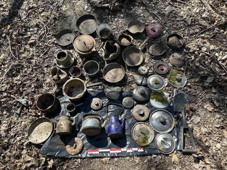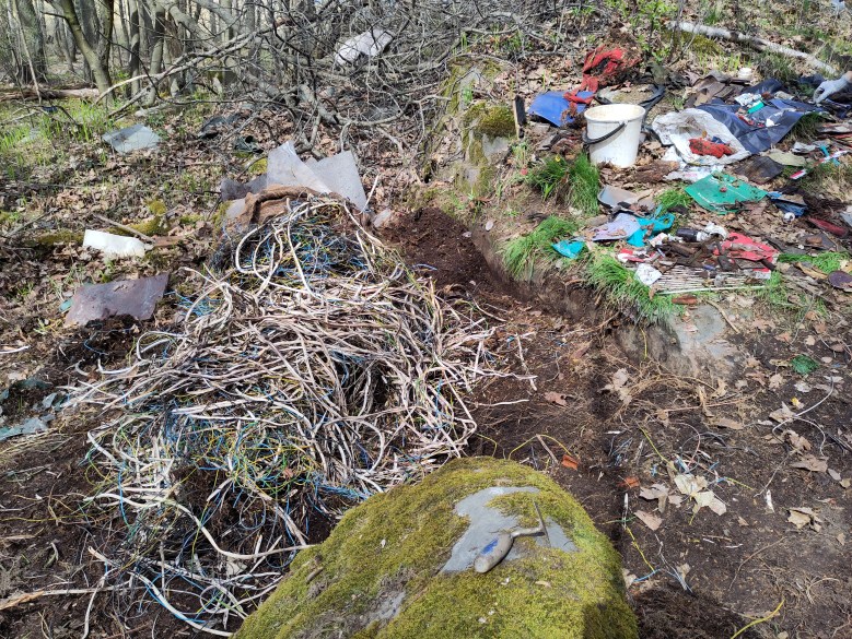 Entä aiemmin mainittu ”rikospaikka”? Tämä kallionkolon äärelle levittynyt alue sisälsi päivyreitä, tyhjiä lompakoita ja suuren sykkyrän sähkökaapelien kuoria, joista kupari oli ilmeisesti irrotettu myytäväksi romumetalliksi. Kaiken kaikkiaan toistakymmentä lompakkoa ei kerro kovin järjestelmällisestä toiminnasta, kun ottaa huomioon kalentereista ja kerroksen käyttöiästä määriteltävissä olevan useiden vuosien ajoitushaarukan.