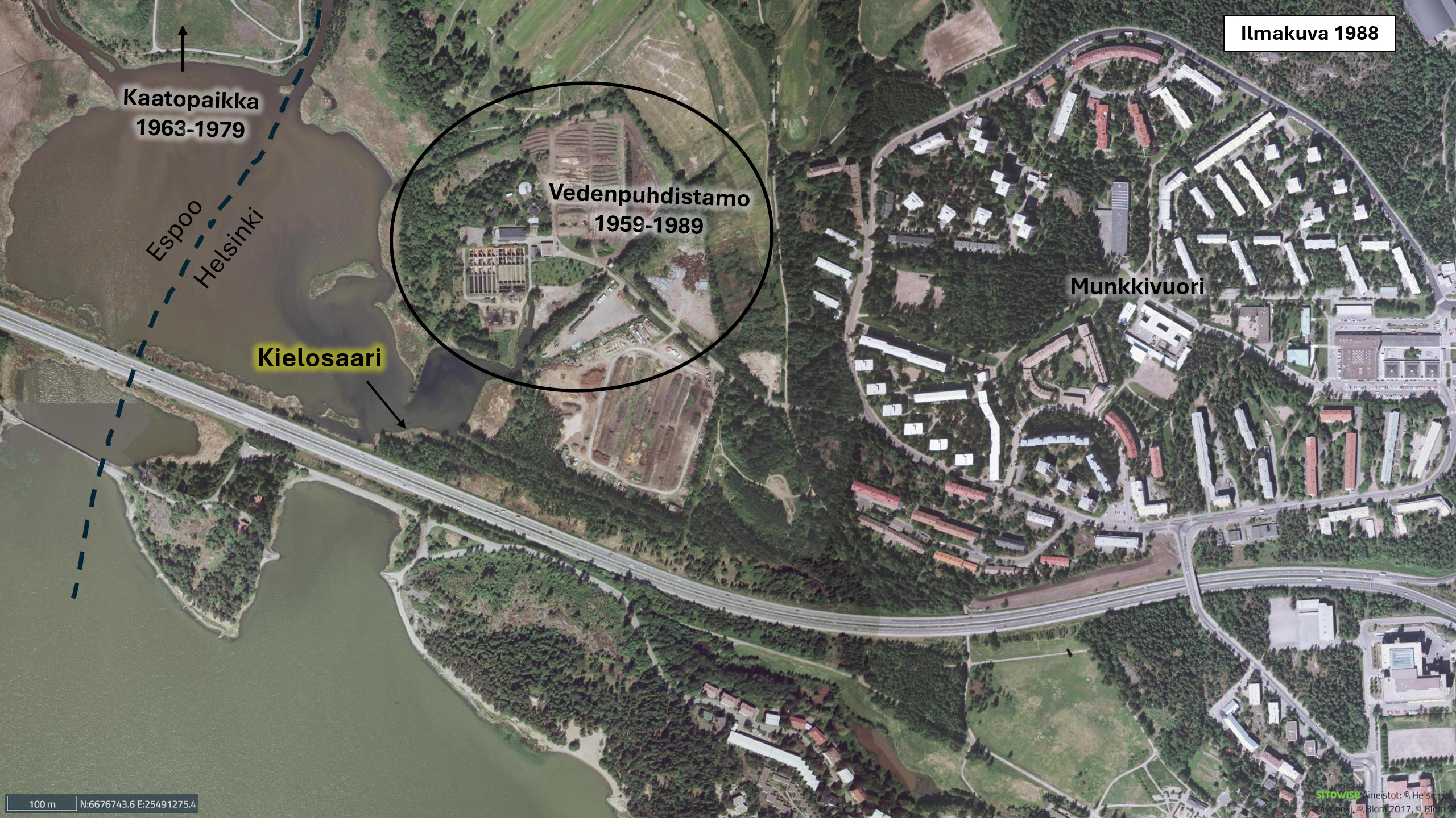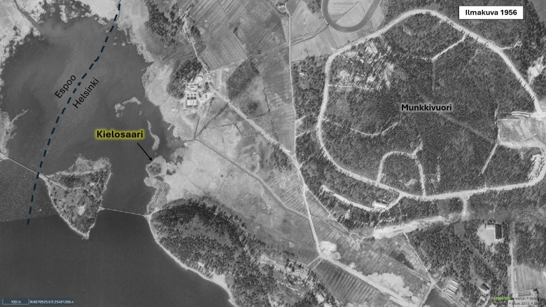 Vuoden 1956 ilmakuvassa Munkkivuori on vasta rakenteilla. Leiri tulee sijoittumaan tuleville joutomaille. Vielä tuolloin Kielosaaressa sijaitsi kalastajatupa, jonka Suomen ensimmäinen moottoritie, Valtatie 1, kuitenkin eristi merenlahdesta 1960-luvun alussa. Tupa hylättiin jossain vaiheessa ennen tätä. 1960-luvulla lahden pohjoispuolelle laajeni myös Espoon puoleinen kaatopaikka, ja lahden pohjukkaan perustettiin jätevedenpuhdistuslaitos. Tämä laitos jatkoi toimintaansa, kunnes se 1990-luvulla korvattiin Talinrannan asuinkortteleilla. Kaatopaikka on nykyään maisemoitua puistoaluetta.