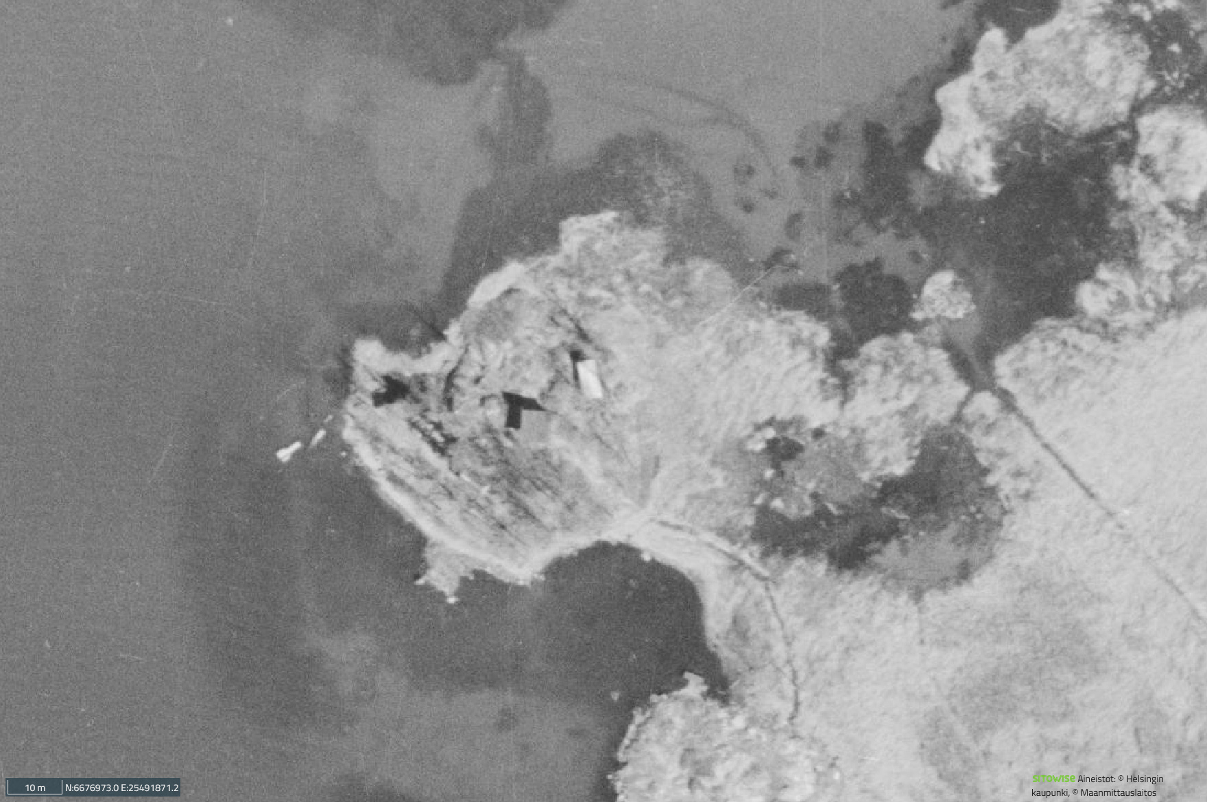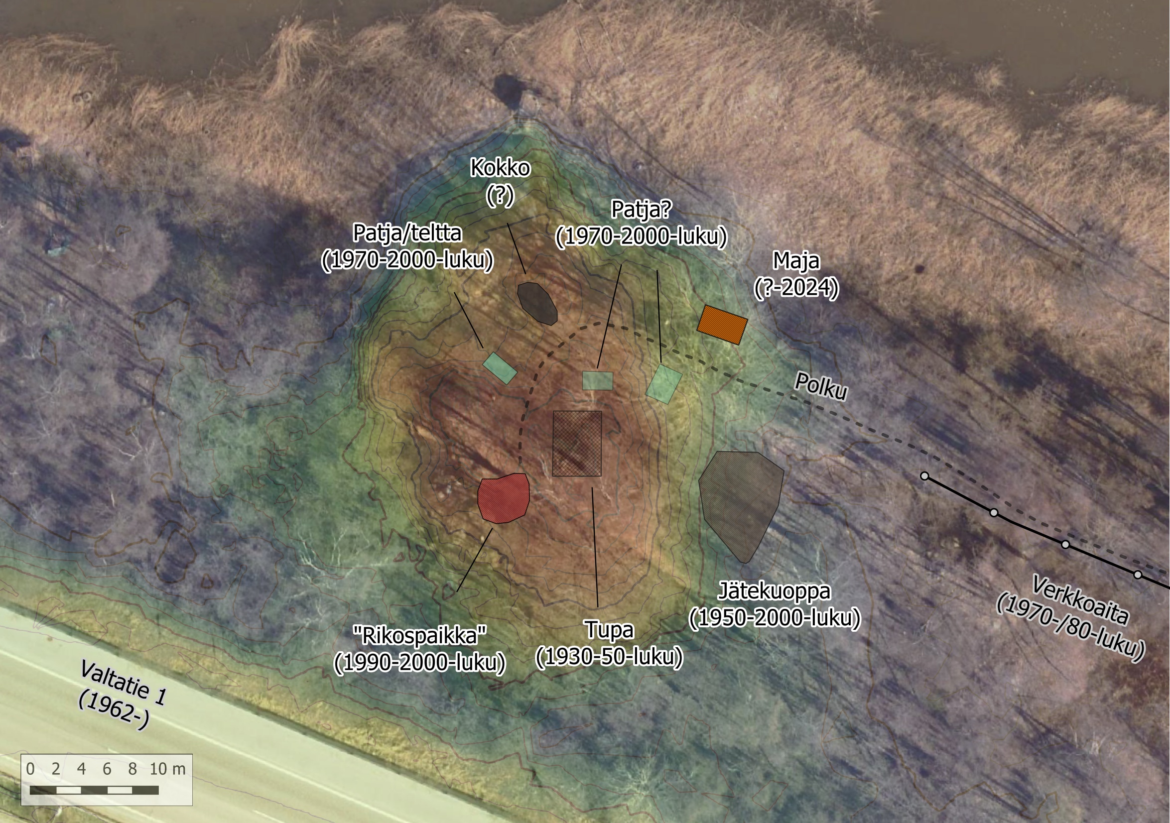 Maastokorkeusmalli auttaa hahmottamaan kohdetta selkeämmin. Paikalle saavutaan polkua pitkin, joka seuraa kaupunginvarikon ulompaa verkkoaitaa. Aidan takana häämöttää Valtatie 1 eli Turun moottoritie. Ensimmäisenä silmiin osuu vaja, jonka rakentamisajankohta ei ole tiedossa, mutta jonka rakennusmateriaalit ovat todennäköisesti peräisin kalastaja-asutuksesta. Tämä varhaisin vaihe näkyy tarkemmin vuoden 1943 ilmakuvassa. Kalastajatupa erottuu korkeimmalla kohdalla sekä sen vieressä vajan tapainen pienempi rakennus.